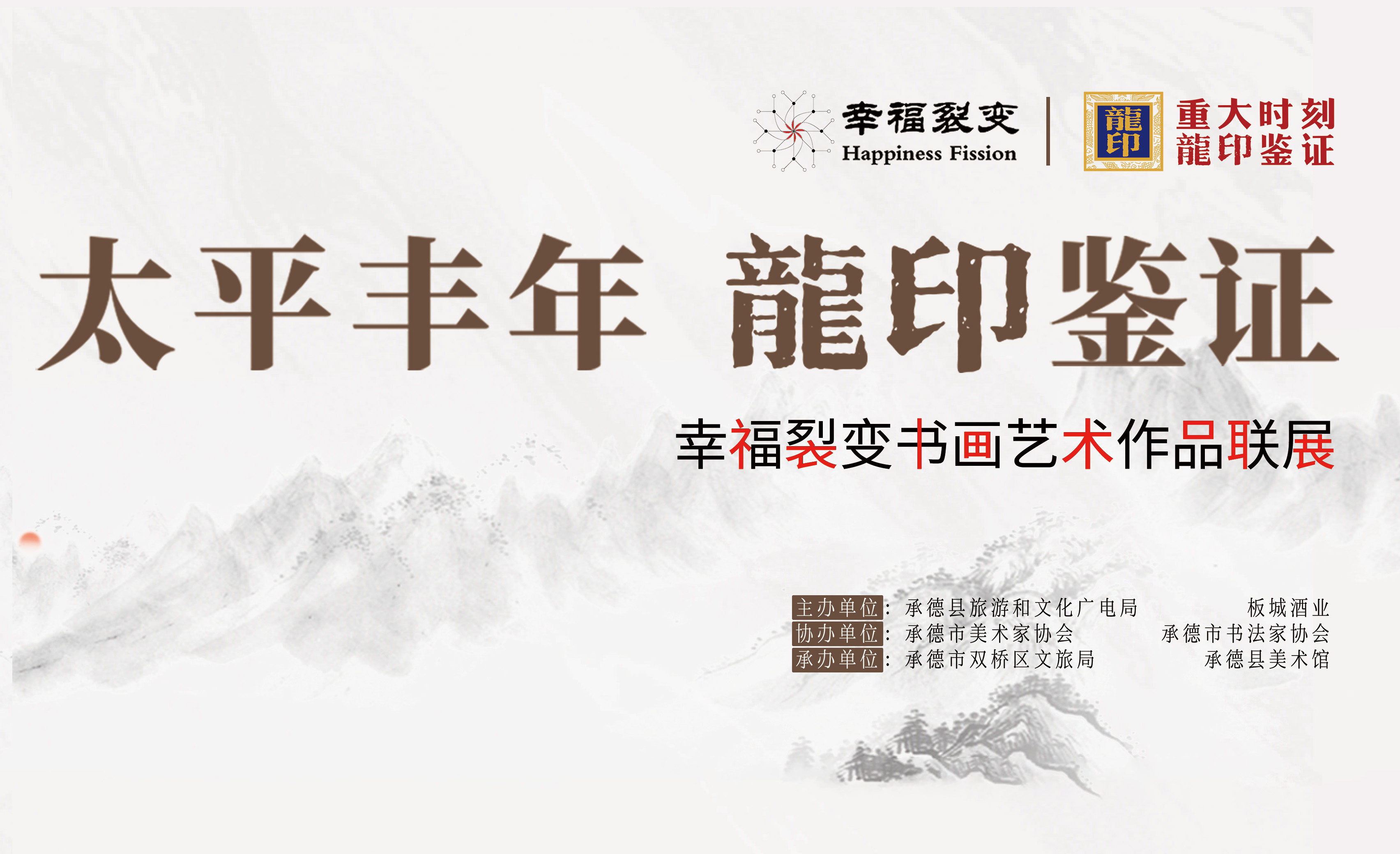 太平豐年,龍印鑒證;9月19日,由承德縣旅游和文化廣電局、板城酒業主辦;承德市美術家協會、承德市書法家協會協辦;承德市雙橋區旅游和文化局、承德縣文化館承辦的“太平豐年龍印鑒證——幸福裂變書畫藝術作品聯展”活動盛大開幕。
