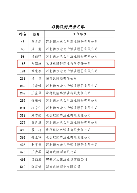 在第五屆全國白酒品酒職業技能競賽中,衡水老白干及旗下四家子公司18位選手穩定發揮,取得良好賽果,被聘任為“2025屆國家級白酒評酒委員”;其中板城酒業孫玉玲、劉志強、王金萍、敖冉、亓海波5位選手參加比賽,通過比賽斬獲優異成績,均被聘任為“2025屆國家級白酒評酒委員”。板城酒業成為河北省除衡水老白干酒業外最多入選人數的酒企,其中,敖冉、亓海波兩名選手初次參賽獲聘國家級白酒評酒委員。